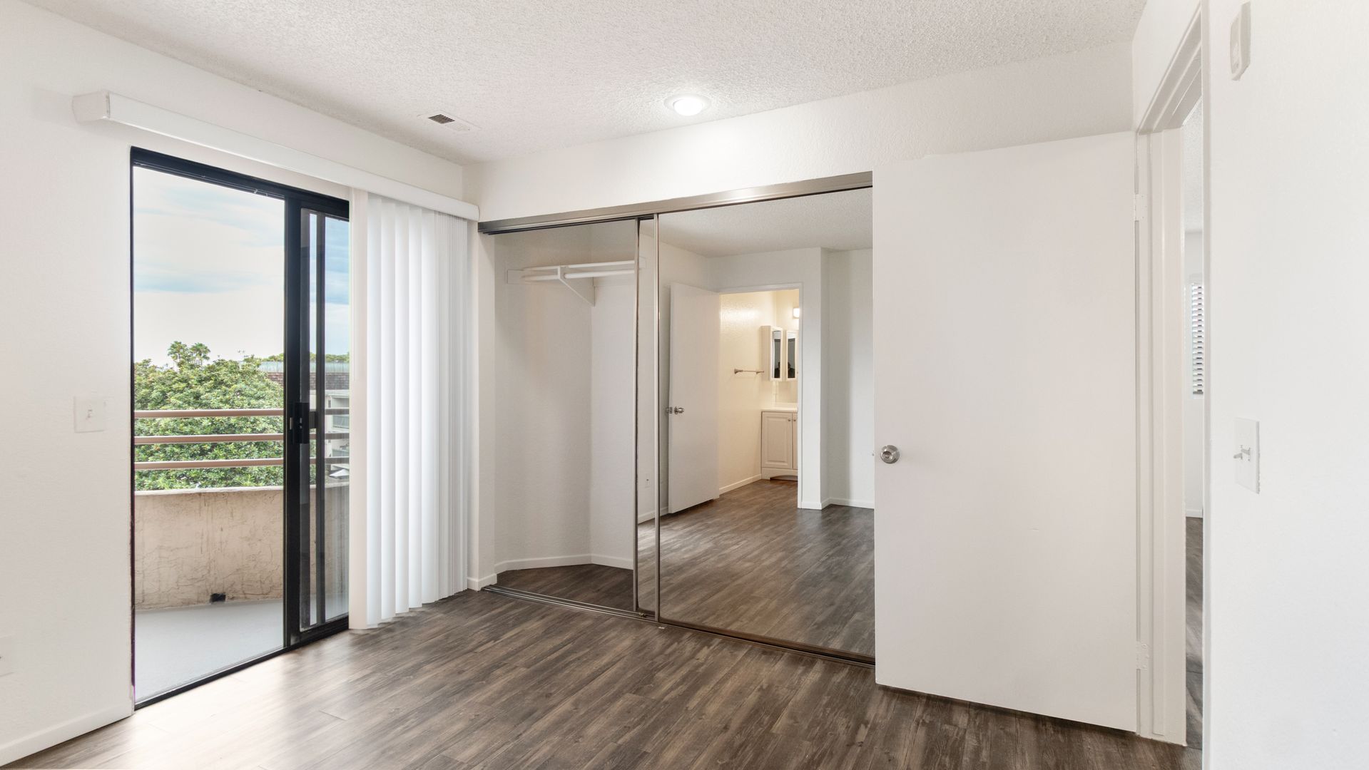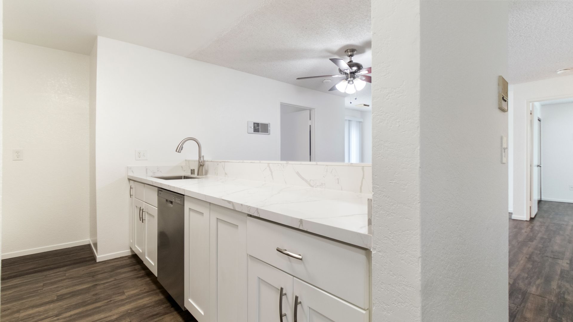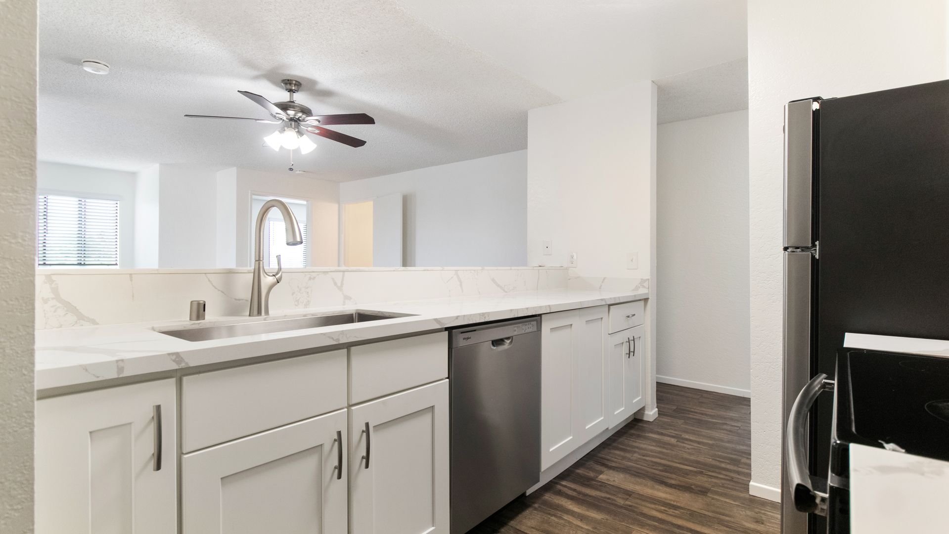 This particular apartment is on the second floor with dual primary bedrooms, two balconies, beautiful quartz countertops, stainless steel appliances including a dishwasher, vinyl plank flooring throughout, mirrored closet doors, and an assigned parking space. It's a must see apartment home! Call now to schedule a tour of our community.