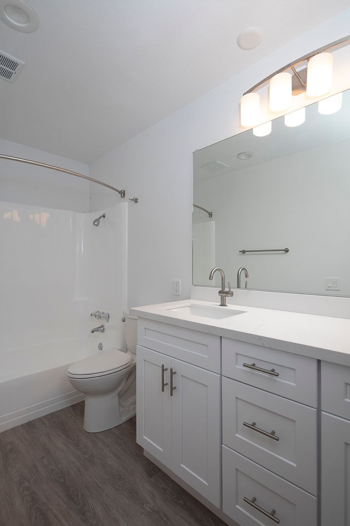 This spacious apartment features beautiful quartz countertops, white shaker cabinets, stainless steel appliances, a dishwasher, and vinyl plank flooring with cozy carpet in the bedrooms. This unit also includes a private balcony.